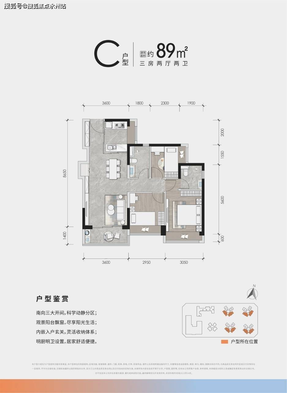 约89㎡三房两卫(1栋2单位2栋3栋1/2单位03/04/05/06户型)保守竖厅款式,三个次卧开间别离为约2.9米,容积率4.14,中转大前海、宝中、南山科技园、福田核心。树立区域核心。连通大阳台,